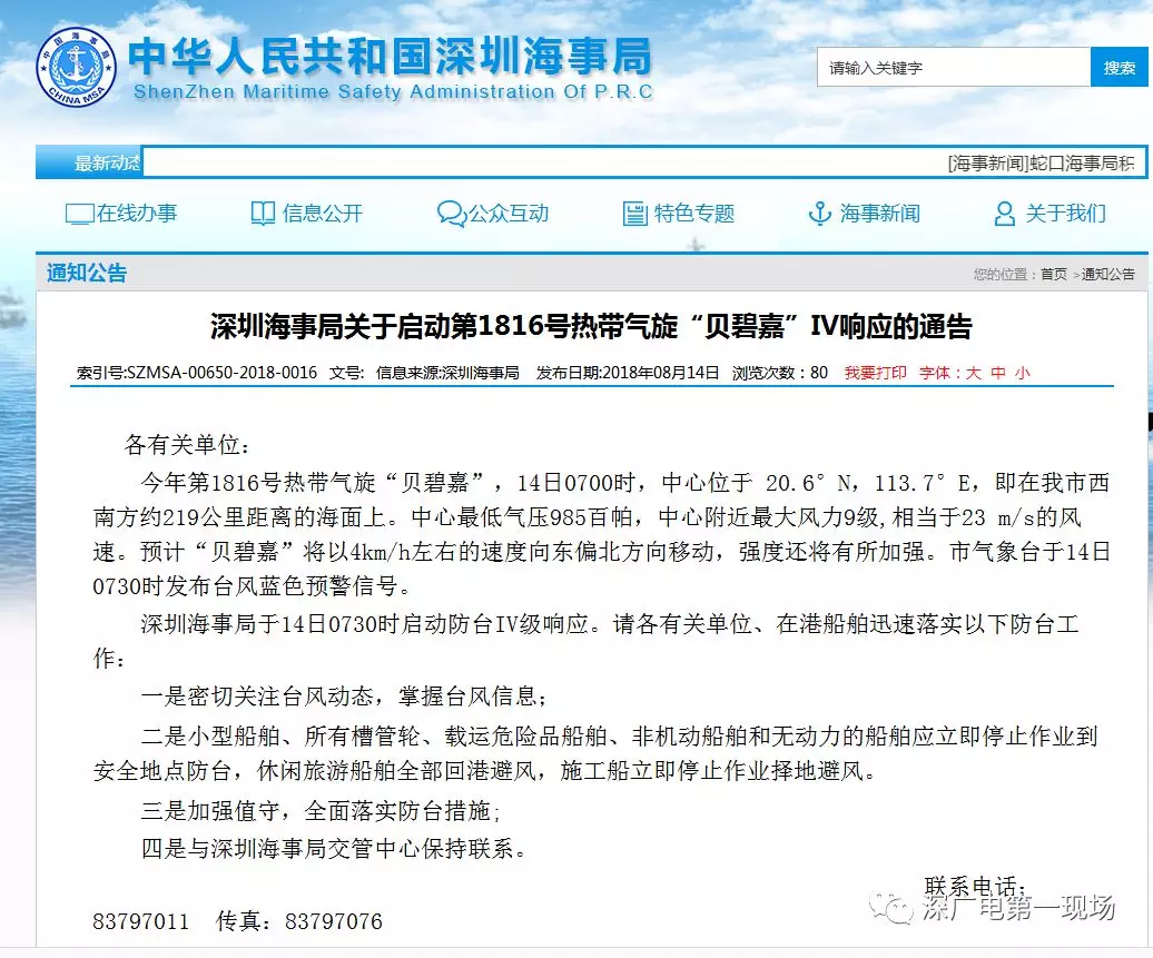 深圳海事局發(fā)布關(guān)于啟動(dòng)第1816號(hào)熱帶氣旋“貝碧嘉”IV響應(yīng)的通告