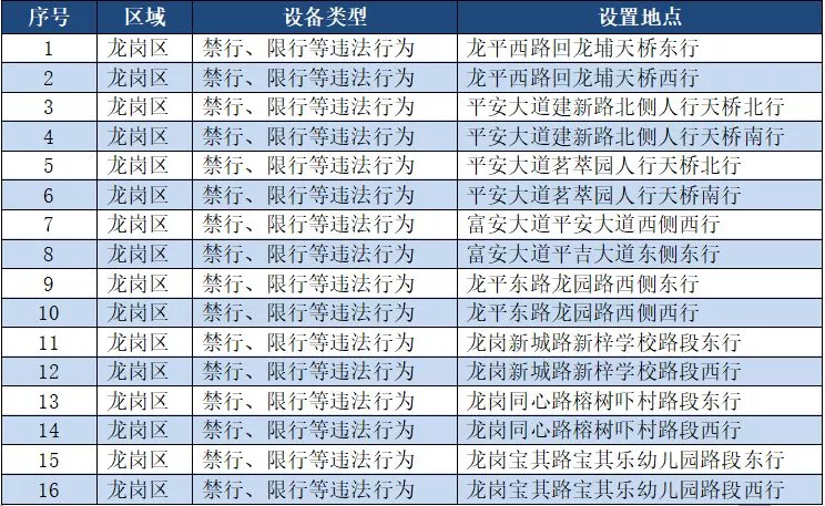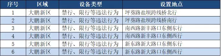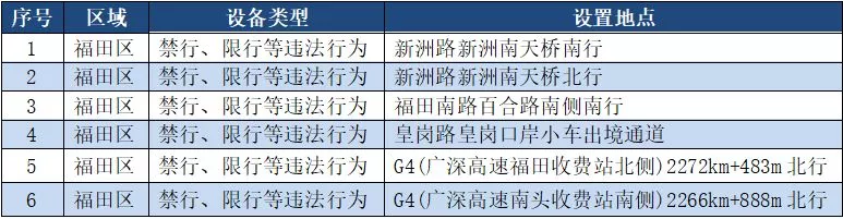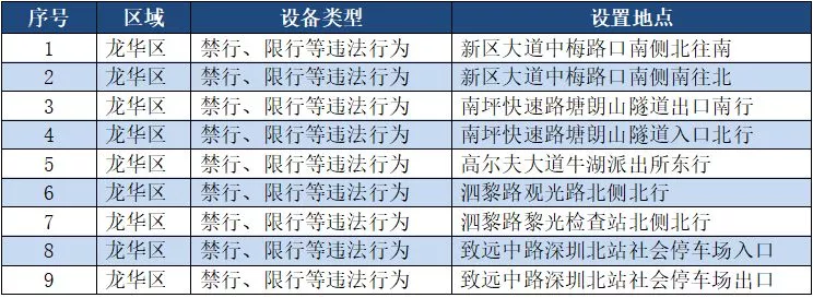 另外,重點整治機動車禁行、限行等多種違法行為的交通技術(shù)監(jiān)控設(shè)備,深圳交警公布啟用87套。涉及福田區(qū)、羅湖區(qū)、南山區(qū)、寶安區(qū)、龍崗區(qū)、龍華區(qū)、光明新區(qū)、坪山區(qū)、大鵬新區(qū)等9個區(qū)域。