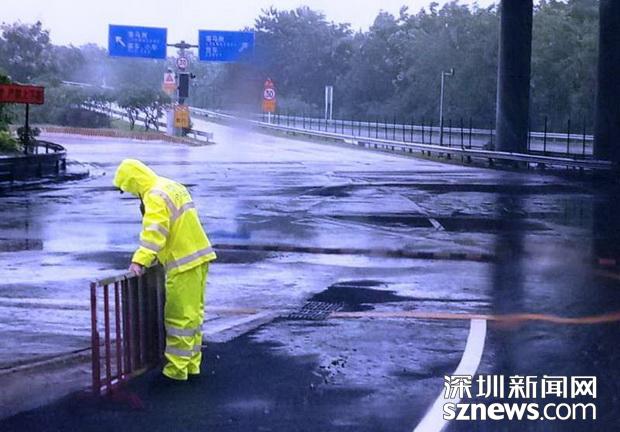 邊檢民警冒雨在強臺風(fēng)中固定好引導(dǎo)分流鐵馬