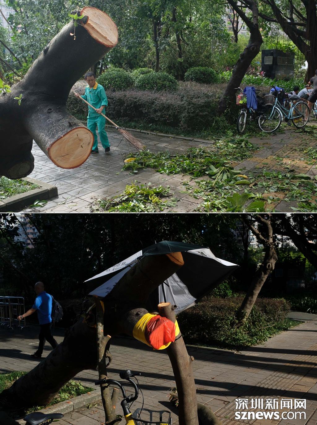蓮花西地鐵站A出口前后對(duì)比圖(上圖:2018年9月17日,臺(tái)風(fēng)過(guò)后,路面一片狼藉,環(huán)衛(wèi)工人正在清掃。下圖 2018年9月18日下午五點(diǎn),路面清掃完畢,恢復(fù)整潔)