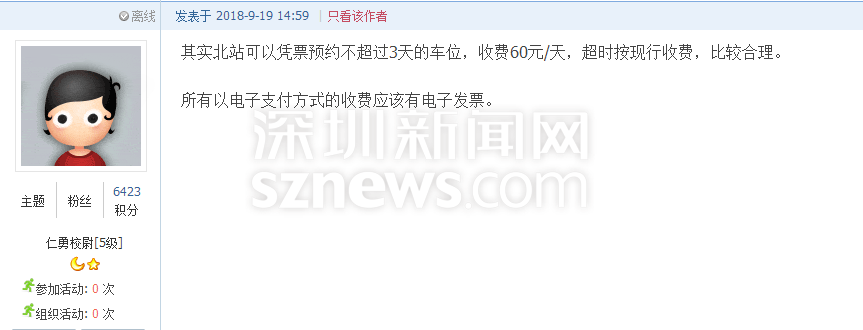 深圳新聞網(wǎng)9月21日訊(記者 施冰冰)“北站停車三天收費412元,這不是暴利嘛?!”近日,深圳一網(wǎng)友發(fā)帖吐槽深圳北站的收費標準,他認為深圳市中心的商業(yè)寫字樓一天封頂也不過60元,高鐵站社會停車場作為老百姓的公共交通基礎(chǔ)設(shè)施,憑什么比市中心的商業(yè)寫字樓還貴2倍多?(帖文:《 北站社會停車場作為老白姓的公共交通基礎(chǔ)設(shè)施,憑什么比市中心的商業(yè)寫字樓還貴2倍多》)