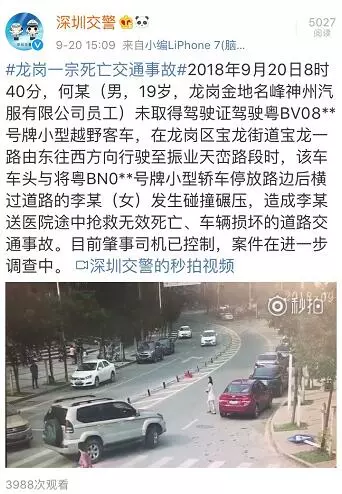 2018年9月20日8時(shí)40分,何某(男,19歲,龍崗金地名峰神州汽服有限公司員工)未取得駕駛證駕駛粵BV08**號(hào)牌小型越野客車,在龍崗區(qū)寶龍街道寶龍一路由東往西方向行駛至振業(yè)天巒路段時(shí),該車車頭與將粵BN0**號(hào)牌小型轎車停放路邊后橫過道路的李某(女)發(fā)生碰撞碾壓,造成李某送醫(yī)院途中搶救無(wú)效死亡、車輛損壞的道路交通事故。目前肇事司機(jī)已控制,案件在進(jìn)一步調(diào)查中。