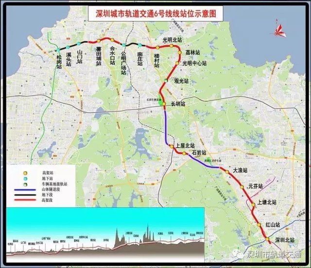 深圳地鐵6號線全長約49.4km,其中一期工程長約37.6km,起自深圳北站綜合交通樞紐,終于松崗站,設(shè)車站20座(其中地下站5座,高架站15座),與4、5、11、13、15號線及廣深港客運(yùn)專線綜合換乘。