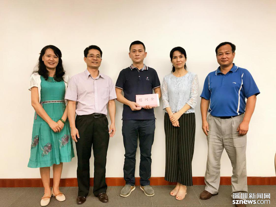 從左至右:梅林中學黨總支部書記何俊、深圳市教育局德體衛(wèi)藝處副處長勞期龍、李得父親、深圳市關愛辦副主任華榮、李得教練范華平