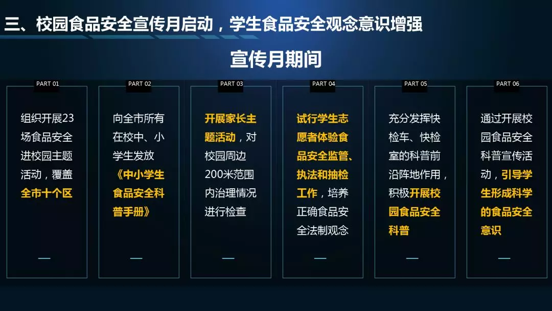 第一個(gè)“3”指“九號(hào)查酒”節(jié)前專(zhuān)項(xiàng)行動(dòng)、校園食品安全宣傳月、深圳市食藥志愿者總隊(duì)開(kāi)展打擊非法售賣(mài)活禽專(zhuān)項(xiàng)執(zhí)法行動(dòng)等情況通報(bào);