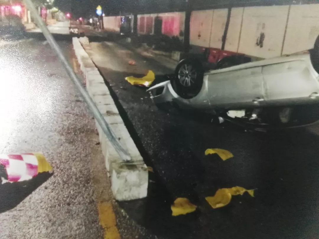 開車犯迷糊,自己撞水泥墩上,來了個(gè)底朝天
