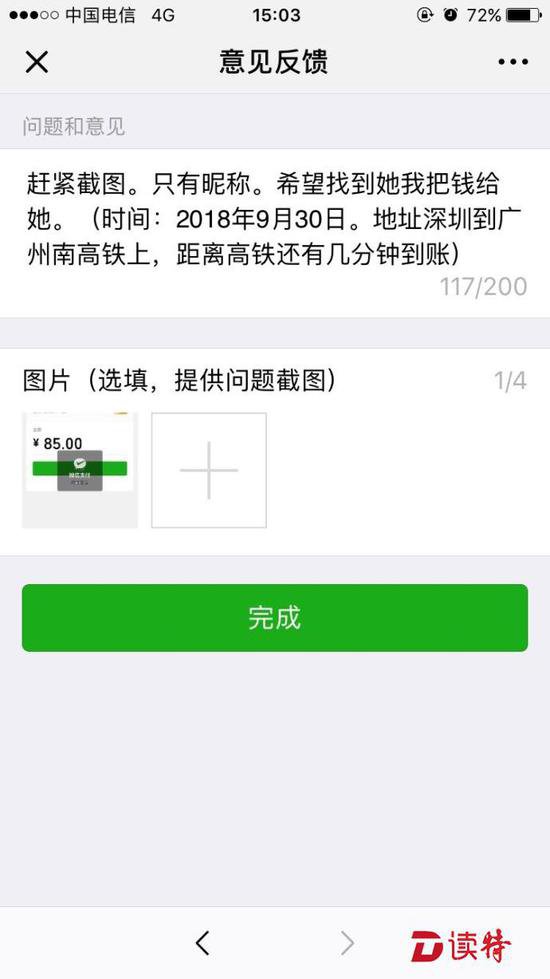 深圳新聞網(wǎng)訊 深圳市民李先生高鐵上補(bǔ)票,因?yàn)闆]帶現(xiàn)金,向一位女乘客借了85元現(xiàn)金,他用微信向女乘客轉(zhuǎn)賬時(shí),由于高鐵上手機(jī)網(wǎng)絡(luò)不好,還沒等轉(zhuǎn)賬成功,女乘客就匆匆下車了。這件事讓李先生耿耿于懷,希望市民網(wǎng)友幫忙尋找這位好心女乘客,讓他能把85元還給她。
