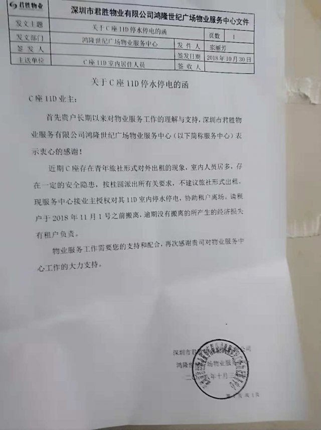 10月30日鴻隆世紀廣場物業(yè)服務中心物業(yè)發(fā)出關于 C座11D停水停電函,表示 C座存在青年旅社形式對外出租的現(xiàn)象,室內人員居多,存在安全隱患,按桂園派出所有關要求,不建議旅社形式出租。業(yè)主授權物業(yè)中心對11D進行室內停水停電,協(xié)助租戶離場,并要求租戶于11月1日之前搬離。