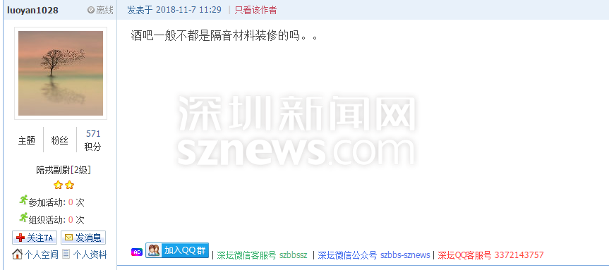 深圳新聞網11月7日訊(記者 施冰冰)11月6日,有網友在論壇爆料稱民治藍坤大廈米蘭國際酒吧每晚營業(yè)至凌晨4點,音樂聲震耳欲聾,嚴重影響了附近居民的睡眠,“逼得”該網友只能搬家。(網帖地址:https://szbbs.sznews.com/thread-3815241-1-1.html)