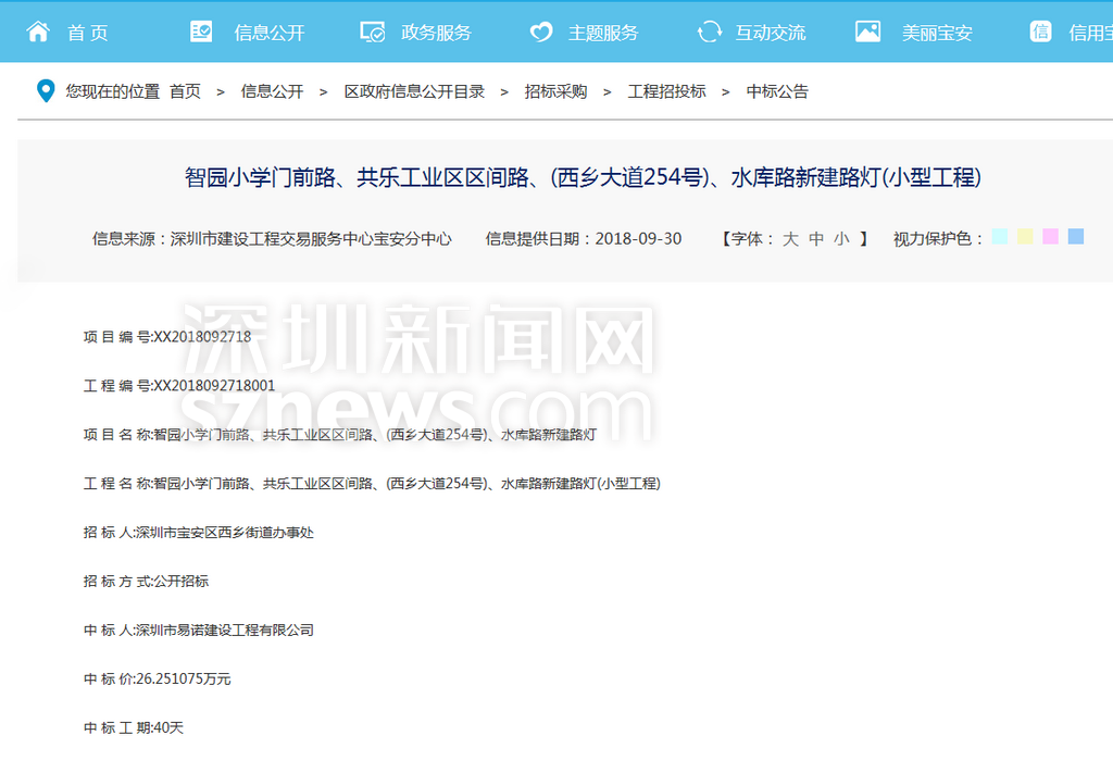 記者從寶安西鄉(xiāng)街道官網(wǎng)中標公告獲悉,智園小學門前路工程施工中標單位是深圳市易諾建設(shè)工程有限公司,中標工期是40天。據(jù)招標公告顯示計劃開竣工時間是2018年10月08日至2018年11月18日。網(wǎng)友希望施工能夠如期完工,道路能夠早日恢復(fù)暢通,施工期間,最好能夠?qū)⑹┕龅睾腿诵械栏糸_,確保學生人身安全。