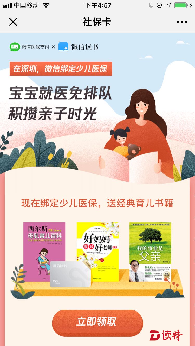 深圳特區(qū)報2018年11月21日訊 作為微信醫(yī)保支付的試點城市,深圳又開通便民新服務,全國內率先開通微信綁定少兒社保卡,支持少兒醫(yī)保線上支付服務。記者獲悉,11月20日起,父母在微信綁定孩子的少兒社??ǎ涂梢杂梦⑿派贤ㄟ^醫(yī)保給孩子繳納掛號、就診費用,省去排隊煩惱。此外,20日起,用戶在微信綁定少兒社保卡,可免費領取微信讀書三本經典育兒書籍和3天無限閱讀卡兌換碼。