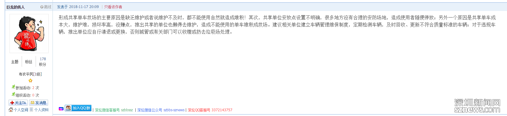 “福田河的水質(zhì)很好,但大量的故障單車停放在路邊實(shí)在是煞風(fēng)景?!本W(wǎng)友“szwtyh”認(rèn)為,不應(yīng)該讓這些單車礙了深圳的城市景觀,掃了市民欣賞福田河水的興致。