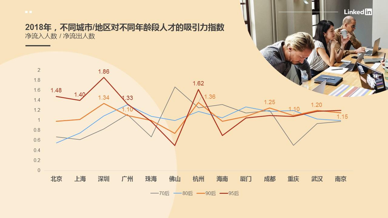 在此前的調研中,領英數(shù)據(jù)顯示90/95后年輕職場人的平均在職時間顯著降低,為了追求更好的工作機會他們不介意頻繁跳槽。而這樣的高流動性同樣也體現(xiàn)在城市的變動上。以職場人總工作年限/所有生活工作過的城市數(shù)量為衡量依據(jù),領英大數(shù)據(jù)顯示:職場人城市間流動頻率,呈現(xiàn)出隨年齡的降低而增高的趨勢,年輕一代在城市方面的流動性越來越強。