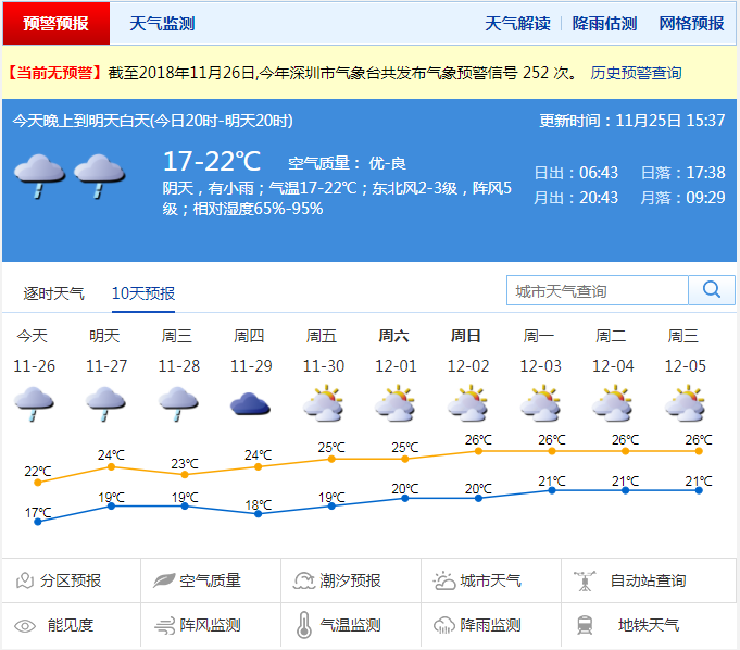 深圳新聞網11月26日訊(記者 施冰冰) 記者從深圳市氣象臺了解到今天陰天,間中有小雨,氣溫17℃-22℃;周二到周四以陰天為主,間中有分散小雨;周五到周日多云,可見陽光,氣溫回升。