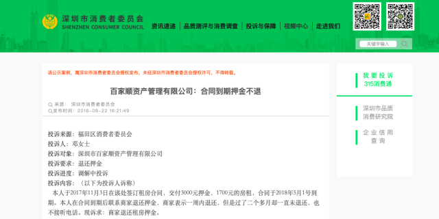 深圳市消委會官網(wǎng)通報對余綿亮公司的投訴