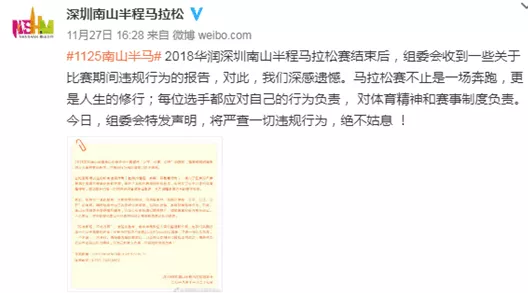 https://mp.weixin.qq.com/s/xge5TY29hk9IjLRMCAG43w希望廣大跑者遵守賽事規(guī)程,尊重其他正常參賽的跑者,尊重體育精神,自覺維護賽場秩序;深圳南山半程馬拉松組委會將在今后賽事中加強賽事監(jiān)督管理并融入技術(shù)手段,以跑者體驗至上,共同營造健康、公正、公平的馬拉松參賽環(huán)境。