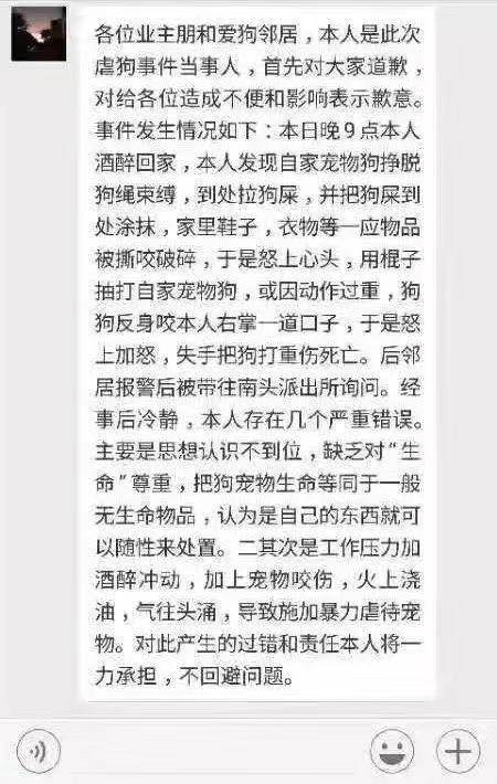 當(dāng)天深夜,男子在業(yè)主群中道歉,稱自己晚上9點(diǎn)醉酒回家,發(fā)現(xiàn)自家寵物狗掙脫狗鏈,到處拉屎還將家里的鞋子、衣物撕咬破碎,抽打自家寵物狗時(shí),又被反咬一口,才會(huì)失手將狗打成重傷,同時(shí)男子表示“對(duì)此產(chǎn)生的過錯(cuò)和責(zé)任本人將一力承擔(dān),不回避問題?!?/p>