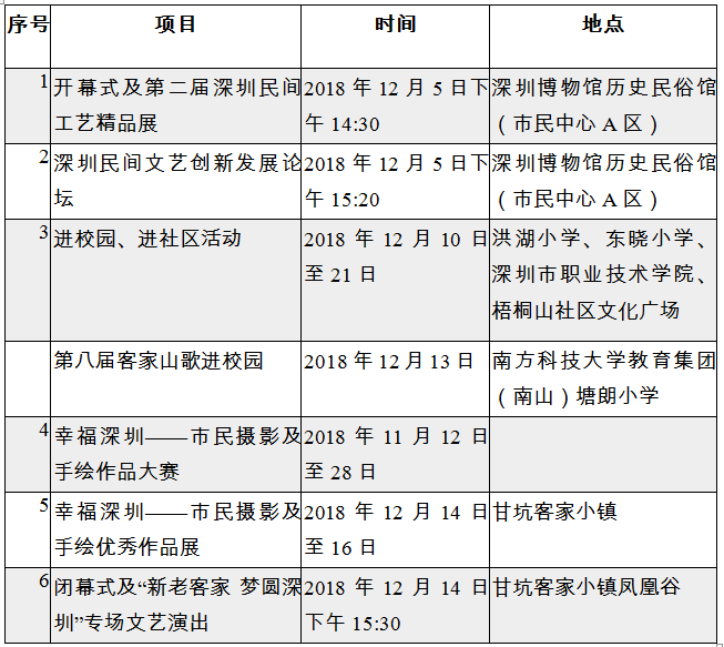 2018年12月10日至21日,將在洪湖小學(xué)、東曉小學(xué)、深圳市職業(yè)技術(shù)學(xué)院、梧桐山社區(qū)文化廣場舉辦4場進(jìn)校園、進(jìn)社區(qū)活動,組織民間藝術(shù)家表演客家山歌、陶笛、葫蘆絲、排簫、鋸琴、口哨、葉哨、粵曲,展示剪紙、剪影、臉譜繪制技藝,并現(xiàn)場與觀眾進(jìn)行互動體驗(yàn)。
