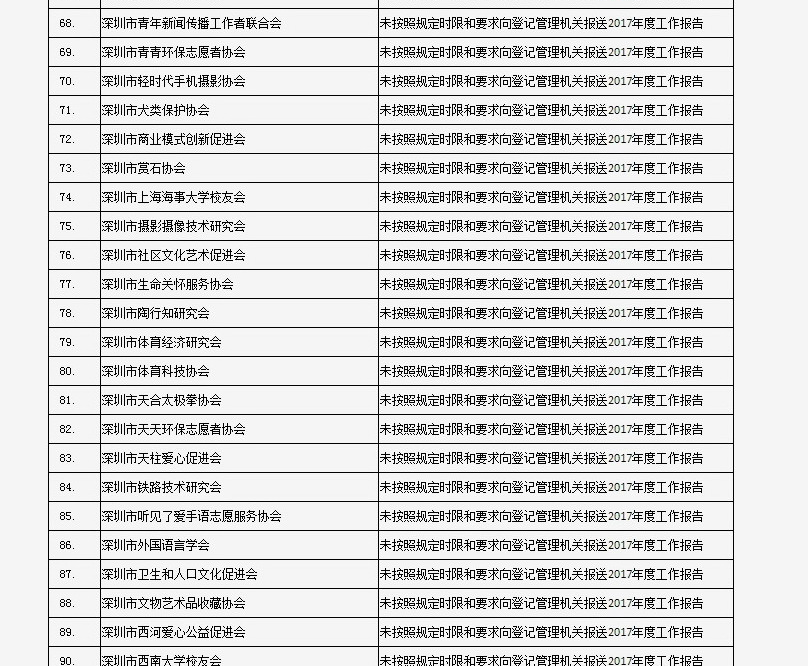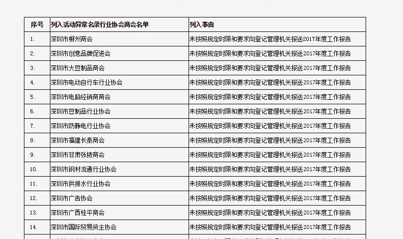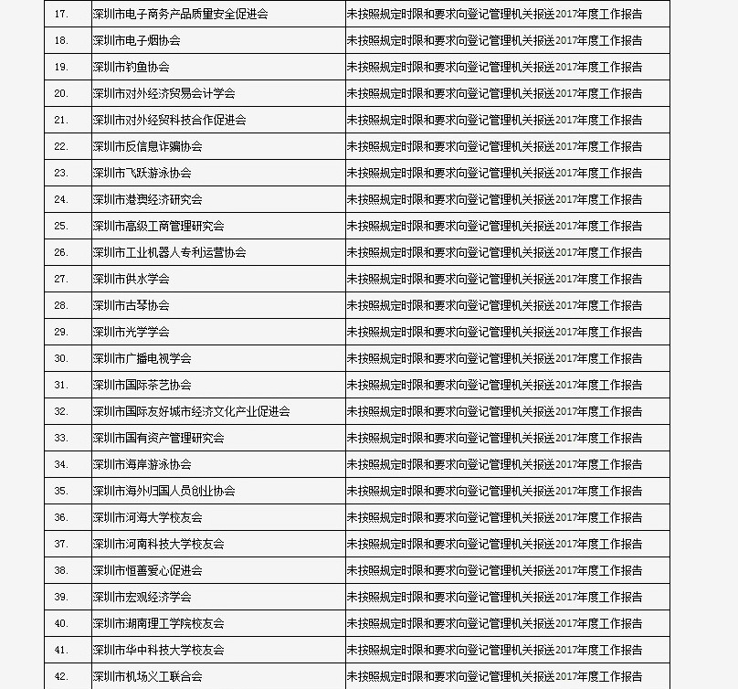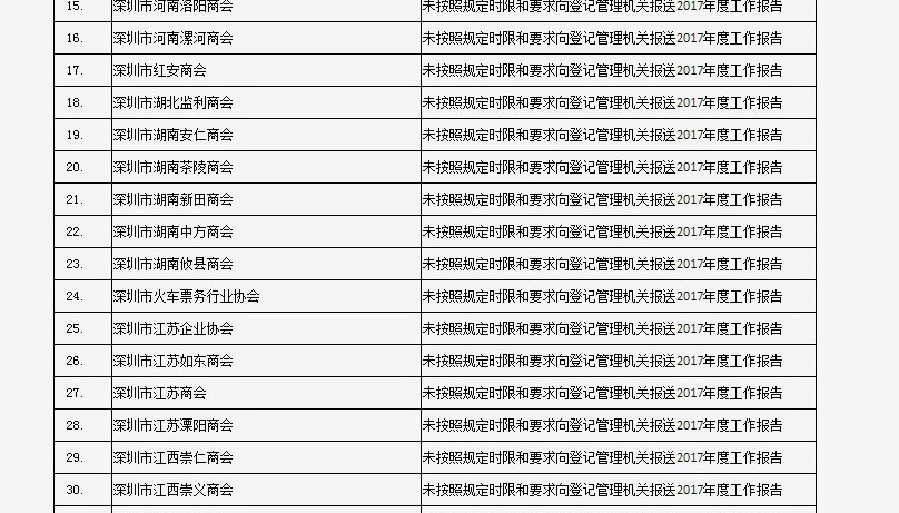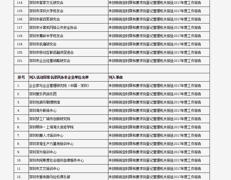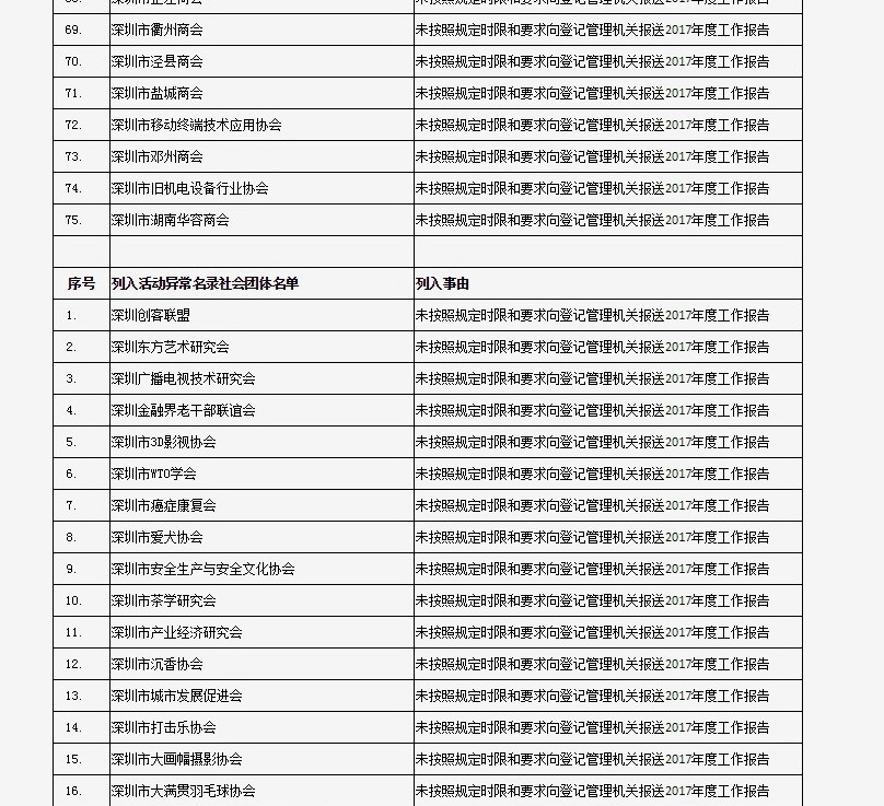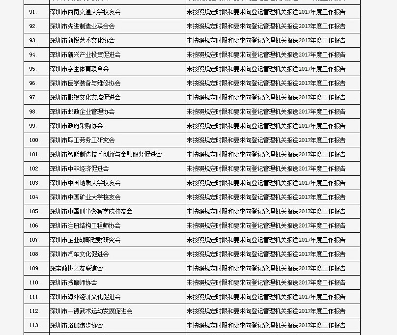 據(jù)深圳市民政局通報(bào),深圳市華中科技大學(xué)校友會和深圳市深圳大學(xué)校友會等121家社會團(tuán)體、深圳市郴州商會等75家行業(yè)協(xié)會商會、企業(yè)家與企業(yè)管理研究院(中國·深圳)等201家民辦非企業(yè)單位、深圳市明園慈善基金會等20家基金會,經(jīng)查“未按照規(guī)定時限和要求向登記管理機(jī)關(guān)報(bào)送2017年度工作報(bào)告”,違反了《社會組織信用信息管理辦法》《深圳經(jīng)濟(jì)特區(qū)行業(yè)協(xié)會條例》的相關(guān)規(guī)定,被列入活動異常名錄名單。完整版名單已在“深圳民政在線”公布。