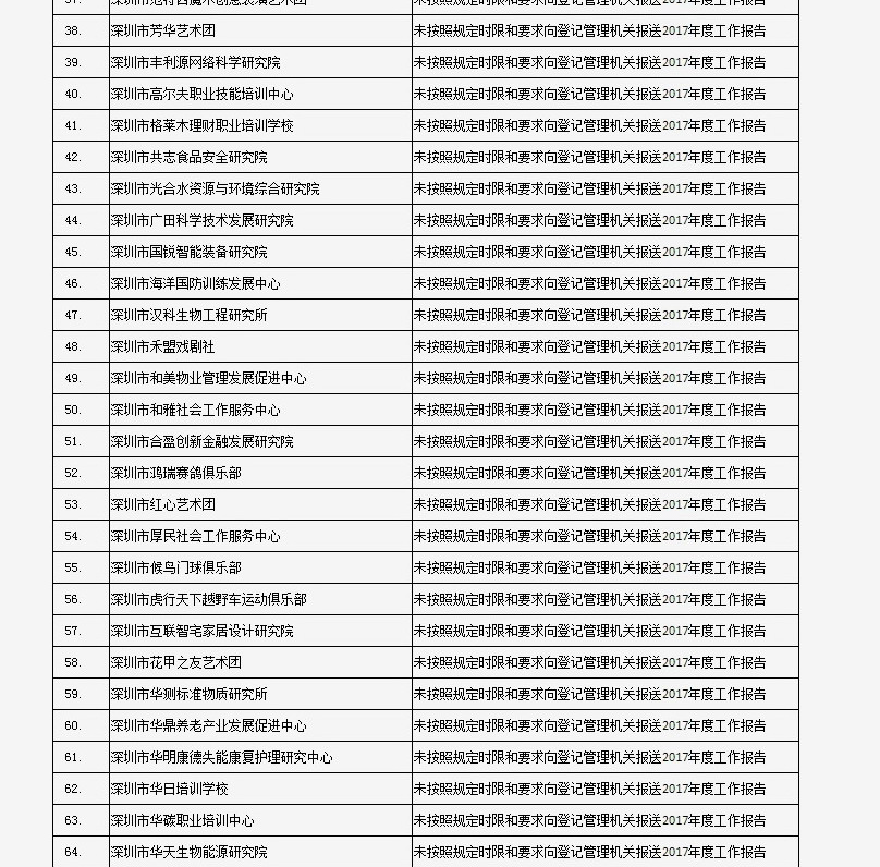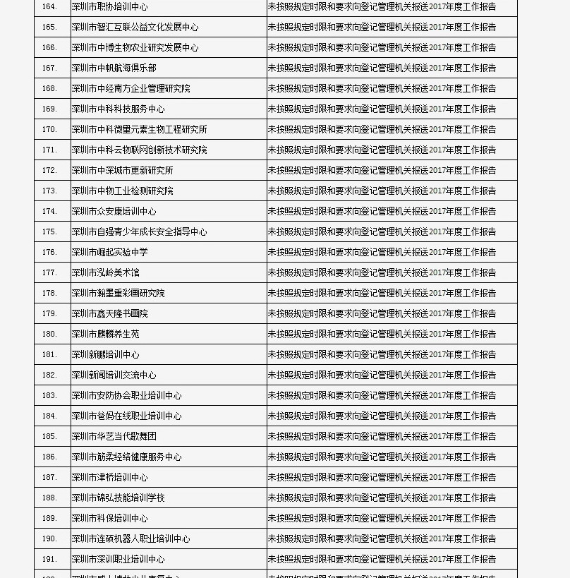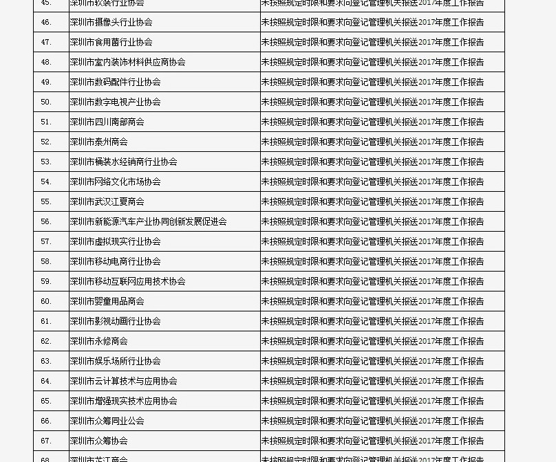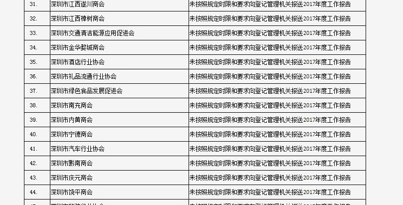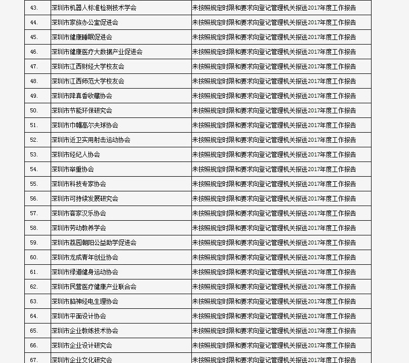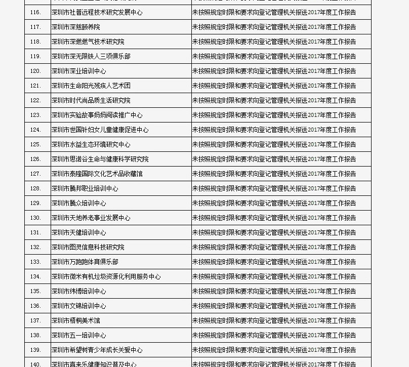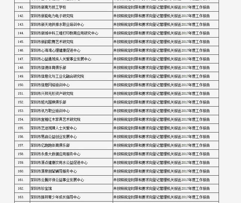 據(jù)深圳市民政局通報(bào),深圳市華中科技大學(xué)校友會和深圳市深圳大學(xué)校友會等121家社會團(tuán)體、深圳市郴州商會等75家行業(yè)協(xié)會商會、企業(yè)家與企業(yè)管理研究院(中國·深圳)等201家民辦非企業(yè)單位、深圳市明園慈善基金會等20家基金會,經(jīng)查“未按照規(guī)定時限和要求向登記管理機(jī)關(guān)報(bào)送2017年度工作報(bào)告”,違反了《社會組織信用信息管理辦法》《深圳經(jīng)濟(jì)特區(qū)行業(yè)協(xié)會條例》的相關(guān)規(guī)定,被列入活動異常名錄名單。完整版名單已在“深圳民政在線”公布。
