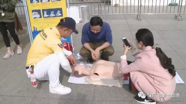 在市民中心廣場(chǎng)的另一側(cè),還有賽場(chǎng)醫(yī)療救援志愿者,在地面上擺出模型,為參賽選手普及心肺復(fù)蘇等方面的急救知識(shí)。在明天賽事進(jìn)行期間,多組救援團(tuán)隊(duì)也將在現(xiàn)場(chǎng)為參賽者提供緊急救援。