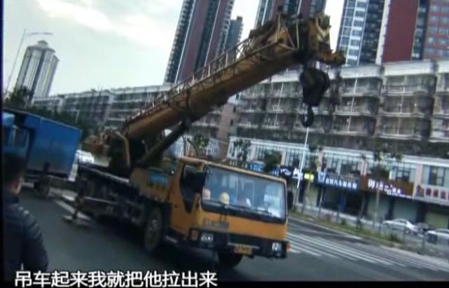 盡管大家都想盡了辦法,但貨車的重量仍然讓被壓的司機無法脫身。這時,有人看到了一部吊車經(jīng)過,馬上向吊車司機求救。