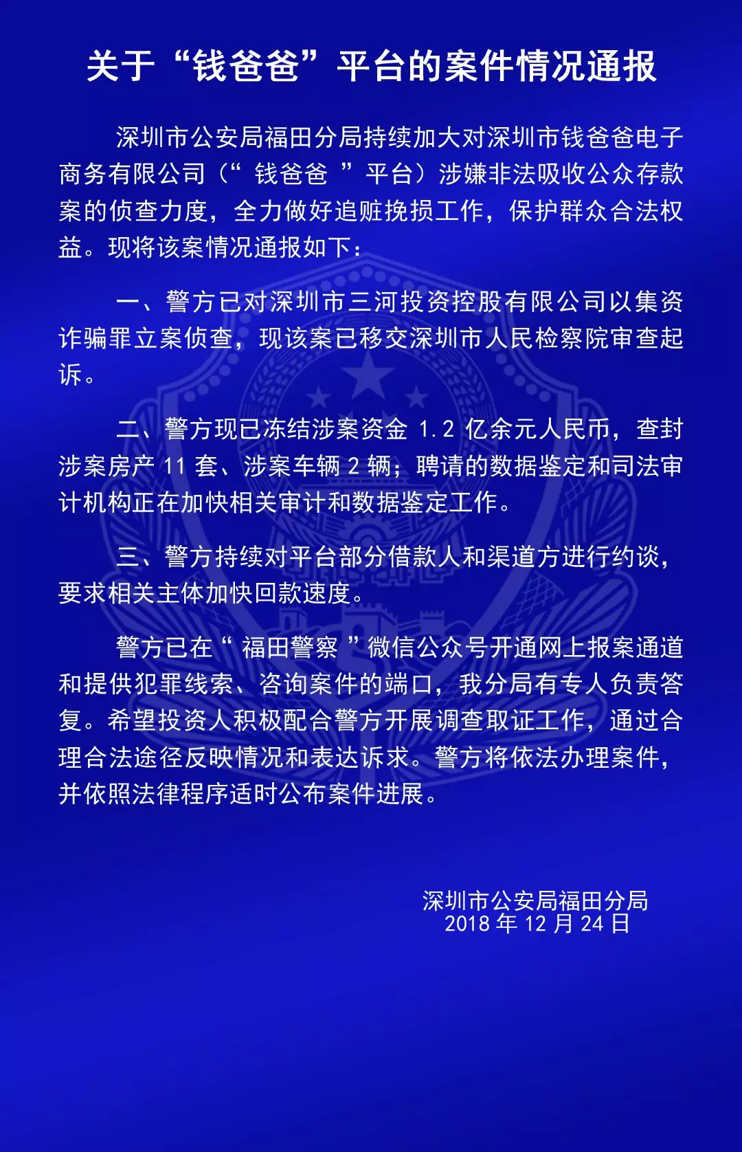 關(guān)于“合拍在線”“壹佰金融”“五星財富”“眾車在線”“財富中國”“小零錢”“錢爸爸”“合時代”和“前金融”平臺的案情通報