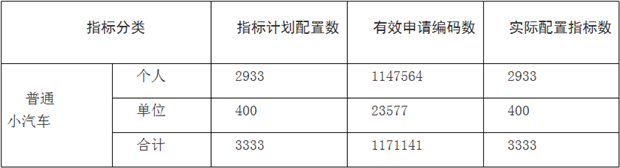 據(jù)悉,2018年第11期以搖號方式配置的普通小汽車增量指標共3333個,其中個人2933個、單位400個。參加搖號的有效編碼數(shù)共1171141個,其中個人普通小汽車有效編碼1147564個,單位普通小汽車有效編碼23577個。