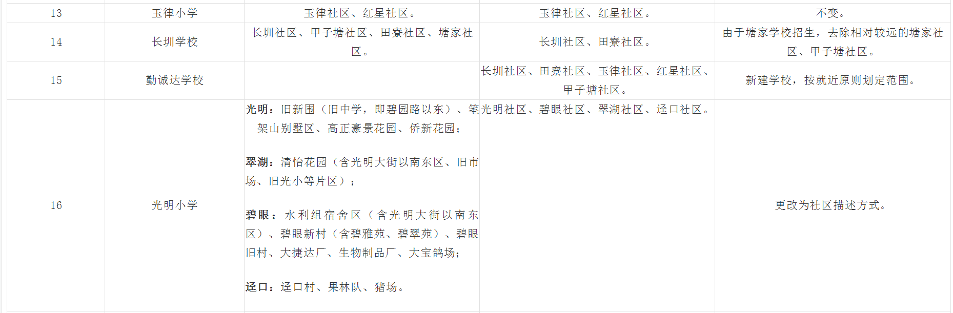 據悉,2019年光明區(qū)招生原則是原有學校招生范圍盡量保持不變,新增學校招生范圍根據招生規(guī)模、生源情況等按就近原則劃定。由于增加了勤誠達學校、信宏城小學、新城學校、塘家學校、白花學校等5所新建學校,鳳凰學校擴建項目也已完成,因此,招生片區(qū)擬做調整為:白花社區(qū)不再安排至光明中學;光明外國語學校招生去除田寮、長圳、甲子塘片區(qū);光明1號小區(qū)劃歸較近的塘家學校和鳳凰學校招生;馬山頭學校招生去除合水口片區(qū);光明第二中學招生去除相對較遠的塘尾片區(qū)。公明二小、下村小學招生去除相對較遠的公明社區(qū);長圳學校招生去除相對較遠的塘家社區(qū)、甲子塘社區(qū)。鳳凰學校招生去除白花,增加光明社區(qū)。