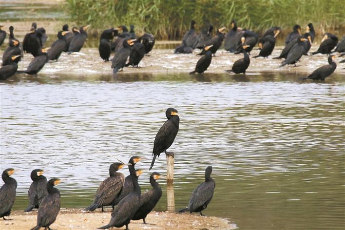 2號(hào)魚塘東側(cè)的3號(hào)魚塘里,則聚集著近千只普通鸕鶿、一小群黑翅長腳鷸和針尾鴨等候鳥。兩只斑魚狗在空中不停穿梭著,搜尋著它們的午餐。當(dāng)發(fā)現(xiàn)目標(biāo)的時(shí)候,它們會(huì)快速地扇動(dòng)雙翼,讓自己懸停在空中,然后突然間像一支離弦之箭一樣直刺水面,閃電般的一擊之后,未等水花落下,它們已經(jīng)叼著一條仍在拼命掙扎的魚兒,飛到岸邊的樹叢中去享用大餐去了。