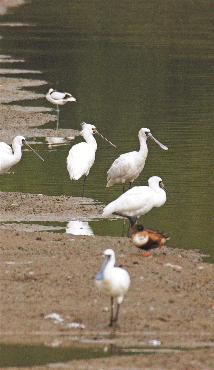 中午12時(shí)許,福田紅樹林國家級(jí)保護(hù)區(qū)的2號(hào)魚塘里,已經(jīng)聚集了45只珍稀候鳥——黑臉琵鷺。在它們身邊,還有數(shù)百只反嘴鷸、針尾鴨、綠翅鴨、琵嘴鴨、赤頸鴨、青腳鷸等候鳥在水中忙著覓食。