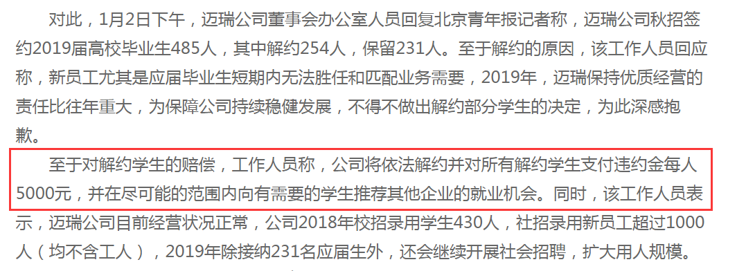 2019年1月2日,邁瑞負(fù)責(zé)人回應(yīng):秋招簽約485人中解約254人,會支付違約金