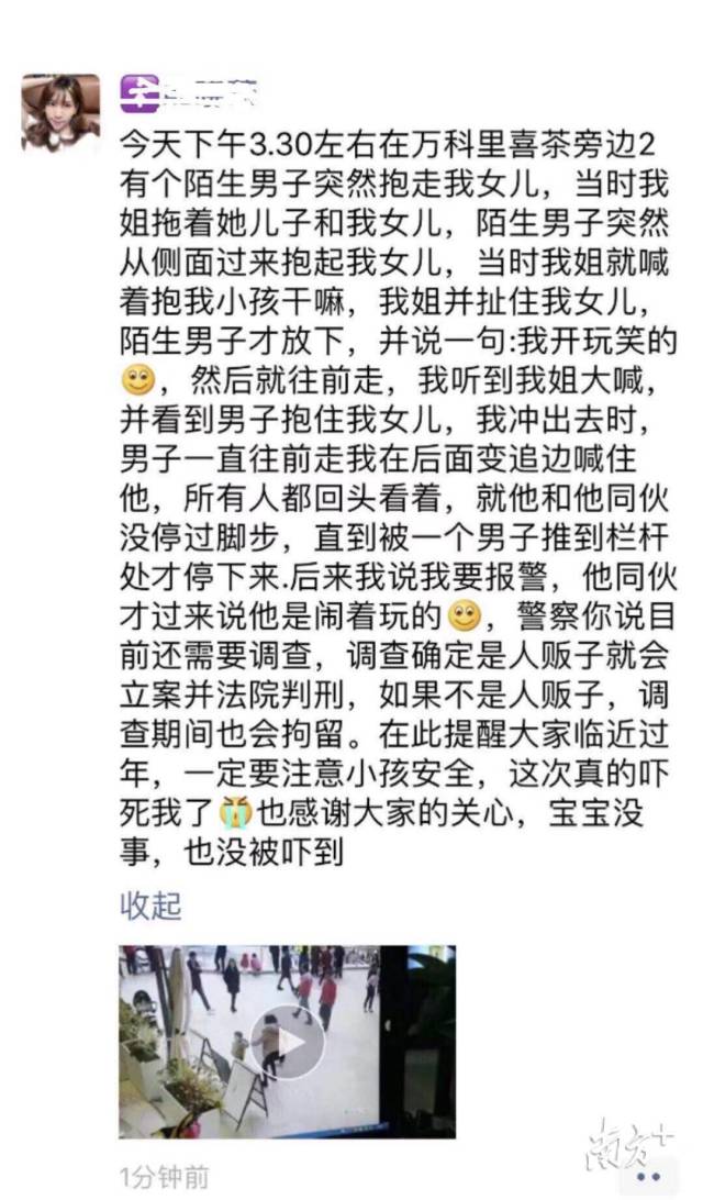 2019年1月1日下午,一位市民發(fā)朋友圈表示:在萬科里逛街時,一名陌生男子突然上前抱走她的女兒,經(jīng)過拉扯制止,該男子才放下孩子。隨后,該女士報(bào)警,而男子則表示自己是鬧著玩的。