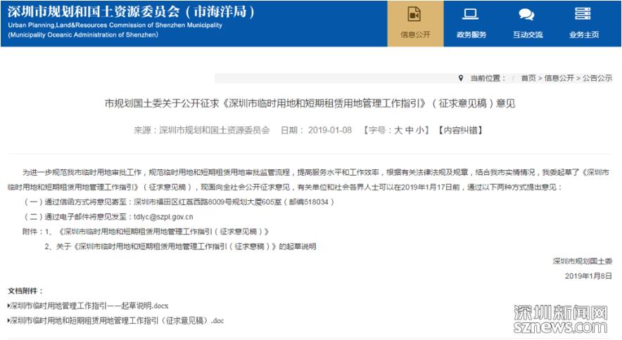 深圳新聞網(wǎng)2019年1月8日訊(記者 潘潤華)1月8日,市規(guī)土委起草發(fā)布《深圳市臨時(shí)用地和短期租賃用地管理工作指引(征求意見稿)》(以下簡稱“征求意見”)。根據(jù)該征求意見,社會投資主體組織實(shí)施的急需公共服務(wù)設(shè)施用地為短期租賃用地,需按照我市地價(jià)測算相關(guān)規(guī)則繳交租金。