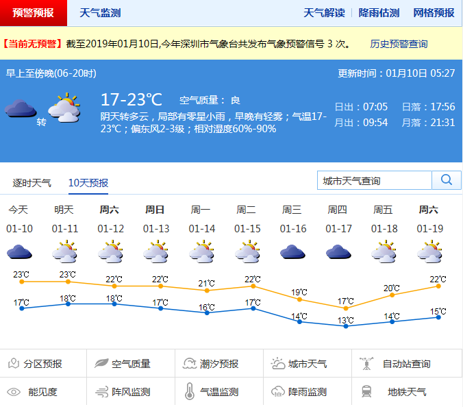 綜合海氣環(huán)流分析和歷史氣候背景,市氣象局預(yù)計(jì)深圳的1月將是“氣溫起伏大、階段性陰冷、降雨少而弱”的特點(diǎn)。分別在15-17日、24-25日、1月底至2月初會有冷空氣影響,伴小雨或分散小雨,沿海和高地陣風(fēng)7-8級,且月內(nèi)最低氣溫10℃以下會有三天左右。而在冷空氣間歇期,則受暖濕南風(fēng)影響,空氣濕度加大,易出現(xiàn)霧和輕微回南天。未來幾日多云間陰天,陽光增多,早晚有輕霧,天氣溫暖,早晚較濕潤;15日起冷空氣影響,氣溫小幅下降。