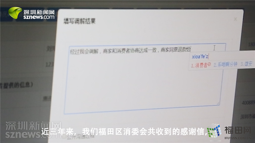 福田區(qū)消委會(huì)工作人員在315投訴平臺(tái)上填寫(xiě)調(diào)解結(jié)果。