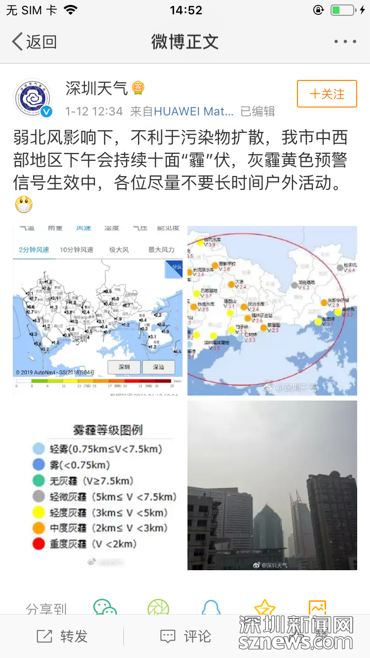 中午12時(shí)34分,灰霾黃色預(yù)警生效中