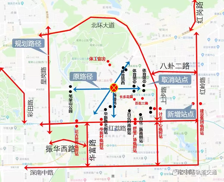 1.臨時(shí)取消站點(diǎn)15個(gè):全封閉施工期間,取消體育館、筆架山公園、海馨苑、體育館西、百花一路等5對(duì)車站,及華新路北側(cè)站、百花二路南側(cè)站、百花村南側(cè)站等,共計(jì)15個(gè)站點(diǎn)(含分站),增設(shè)14個(gè)臨時(shí)??奎c(diǎn)(花卉世界臨時(shí)站、華新村臨時(shí)站、群星廣場臨時(shí)站、計(jì)生中心臨時(shí)站、建設(shè)集團(tuán)臨時(shí)站、體工宿舍、華富北屋村、長樂花園、百花三路)。(詳見圖3)