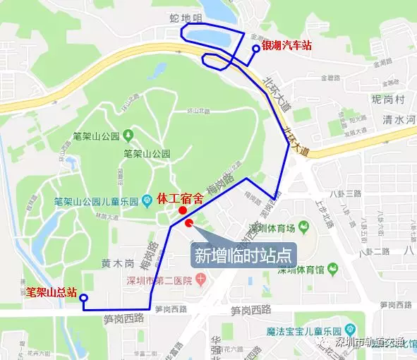 (1)新增筆架山總站-銀湖汽車總站聯(lián)系線路,線路雙向途經筍崗路、梅崗路、泥崗西路、北環(huán)大道。??裤y湖汽車站(銀湖地鐵站)、體工宿舍、市二醫(yī)院①(黃木崗地鐵站)、筆架山總站。(詳見圖5)