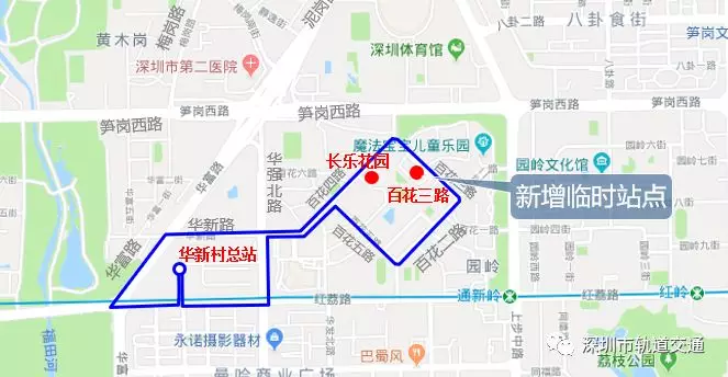 (2)新增華新村總站環(huán)線(單邊順時(shí)針運(yùn)行),線路單向途經(jīng)華富路、華新路、百花四路、百花三路、百花二路、百花五路、百花四路、華強(qiáng)北路、紅荔路。??咳A新村總站、華新村、市話大廈①、華新路、百花四路、長樂花園、百花三路、百花二路、百花村、百花四路、華新村總站。(詳見圖6)
