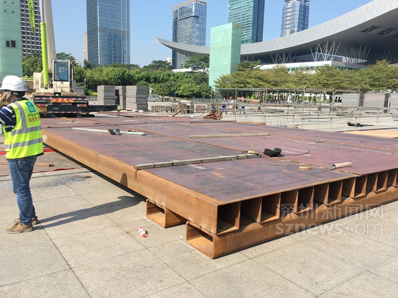 在市民中心南廣場搭建春晚深圳分會場舞臺,借助深圳燈光秀為背景,確實是一個絕佳的創(chuàng)意。要實現(xiàn)創(chuàng)意,搭建舞臺是關(guān)鍵一役。去過南廣場看燈光秀的深圳人應(yīng)該知道,南廣場中間位置正好是地下車庫的玻璃采光棚,春晚主舞臺剛好就位于廣場玻璃采光棚的正上方。玻璃材質(zhì)決定了它無法承受上部集中荷載,需要事先改變傳力路徑或?qū)龅叵虏苛喊暹M行加固處理,謝衛(wèi)兵和同事發(fā)現(xiàn),研究舞臺局部可操作性的加固方案迫在眉睫。