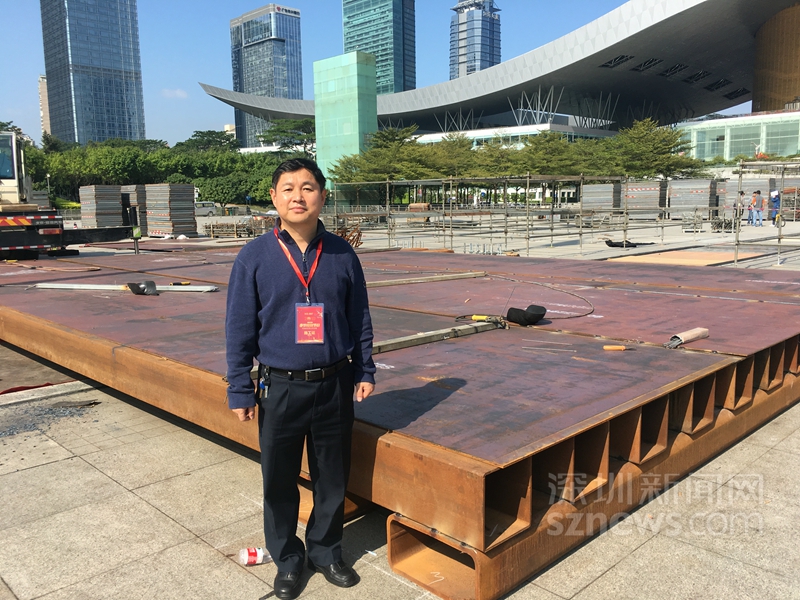 深圳建筑設(shè)計(jì)總院有限公司總工程師王啟文在舞臺(tái)搭建施工現(xiàn)場(chǎng)(王啟文本人提供)