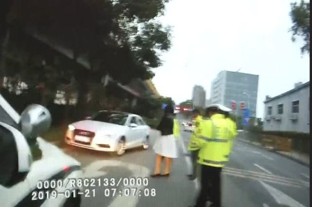 交警:來,酒精測試。最后一次機會,小姐。我現(xiàn)在警告你,再不配合立即去抽血,不要在這里裝,一堆人服侍你,如果你想上頭條,我配合你。