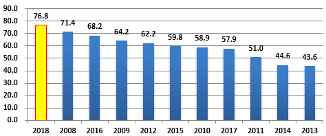 根據(jù)全市區(qū)域自動(dòng)氣象站臺(tái)風(fēng)風(fēng)雨影響綜合年景指數(shù)計(jì)算結(jié)果,2018年臺(tái)風(fēng)風(fēng)雨影響綜合年景指數(shù)達(dá)到76.8,成為2008年以來最嚴(yán)重的一年,超過2008年的71.4。