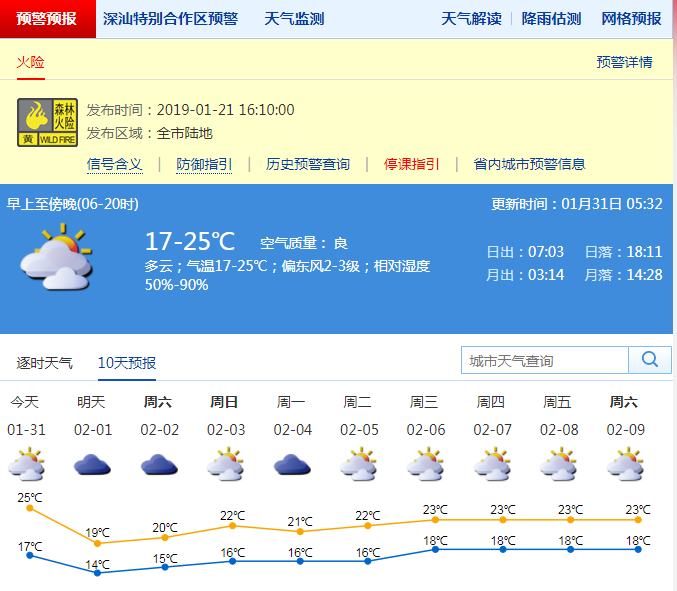 深圳新聞網(wǎng)2019年1月31日訊 深圳氣象局預(yù)計(jì)31日陰天間多云,偶有零星小雨,有輕霧或輕微霾,氣溫16-25℃;1-5日陰天間多云,部分時(shí)間可見陽光,間中有零星小雨,氣溫小幅波動,其中1日受冷空氣影響,沿海和高地偏北風(fēng)最大陣風(fēng)7級,最低氣溫略降3℃左右,3-4日暖濕氣流加強(qiáng),早晚有輕霧或霧。