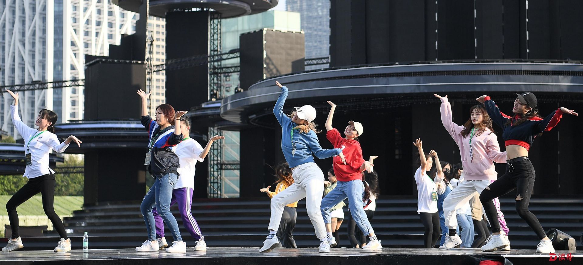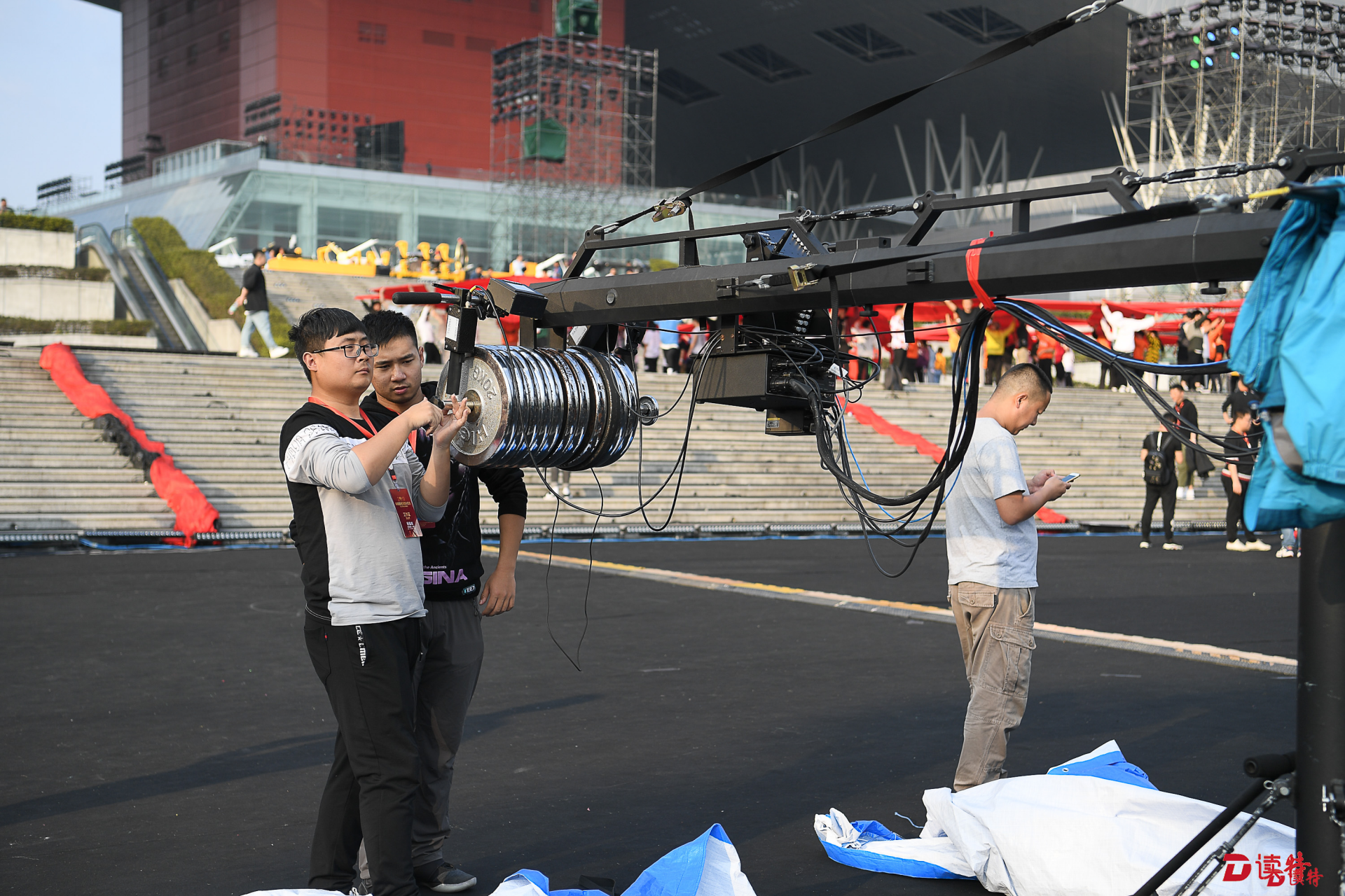 “你們的目光所及都是舞臺(tái)!”當(dāng)記者當(dāng)天下午來到市民中心廣場(chǎng)時(shí)彩排,分會(huì)場(chǎng)總導(dǎo)演孫濱指著搭建的主舞臺(tái)、舞臺(tái)前方的階梯和廣場(chǎng)、以及舞臺(tái)后方的高樓大廈這樣說。