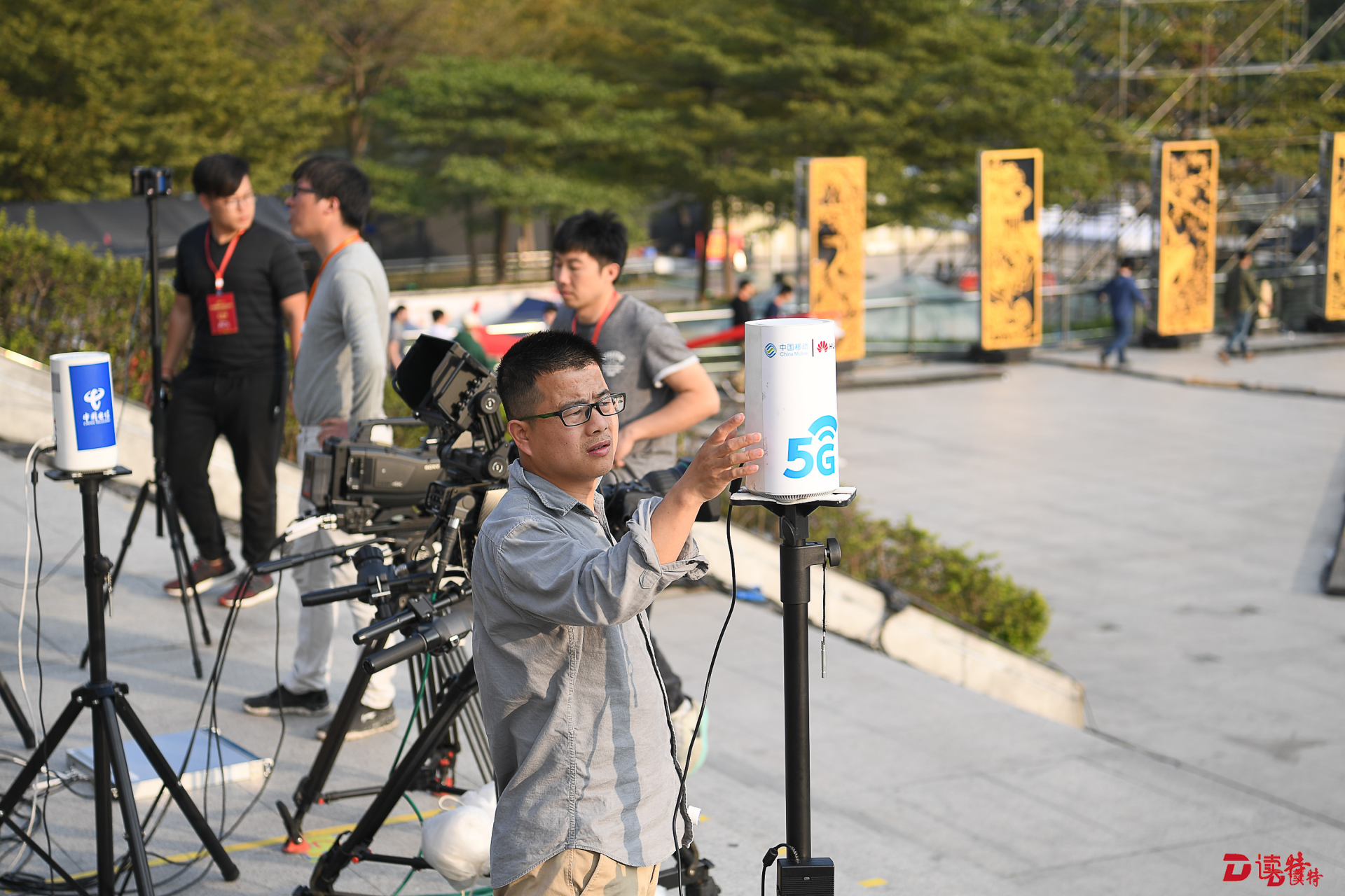 在市民中心廣場(chǎng),央視的5G網(wǎng)絡(luò)VR實(shí)時(shí)制作團(tuán)隊(duì)連日來已經(jīng)在反復(fù)調(diào)試設(shè)備。記者看到,他們的設(shè)備相當(dāng)簡(jiǎn)單便捷,包括有6個(gè)鏡頭的全景攝像頭和5G網(wǎng)絡(luò)接入終端,工作人員手持兩臺(tái)筆記本電腦用于現(xiàn)場(chǎng)VR視頻的縫合,從而實(shí)現(xiàn)VR超高清視頻通過5G網(wǎng)絡(luò)的制作和回傳。