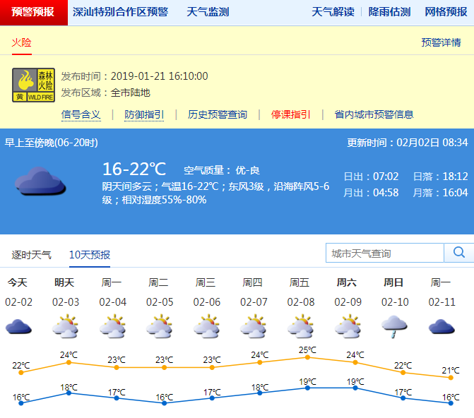 深圳氣象局預(yù)計(jì)2019-02-03: 多云,早晚有輕霧 氣溫: 18-24 2019-02-04: 陰天間多云,有零星小雨,早晚有輕霧或霧 氣溫: 17-23 2019-02-05: 陰天間多云,有零星小雨 氣溫: 16-22 2019-02-06: 多云,早晚有輕霧 氣溫: 17-23 2019-02-07: 多云,早晚有輕霧或霧 氣溫: 18-24 2019-02-08: 多云,偶有零星小雨,早晚有輕霧 氣溫: 19-25 2019-02-09: 多云,偶有零星小雨,早晚有輕霧 氣溫: 19-24 2019-02-10: 陰天有小雨 氣溫: 17-22 2019-02-11: 陰天,有零星小雨 氣溫: 16-21