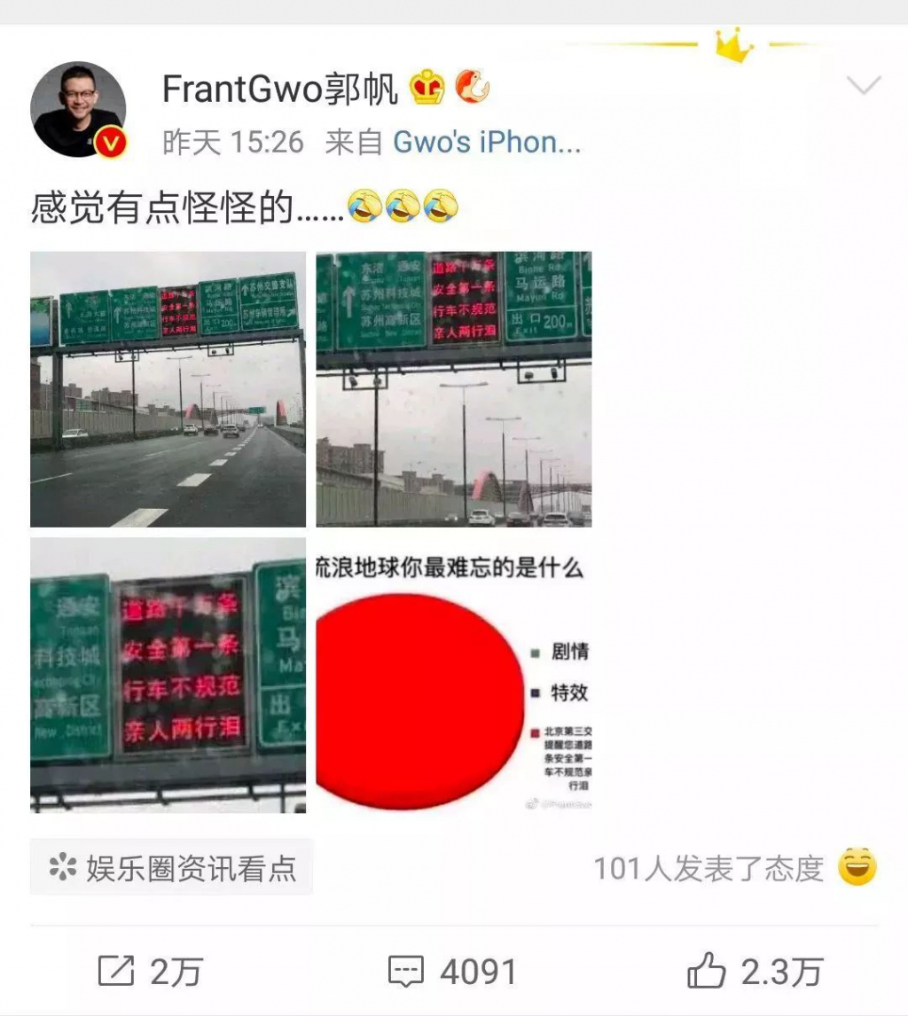 這些現(xiàn)實(shí)中的畫面,也把導(dǎo)演"驚動(dòng)"了,郭帆導(dǎo)演發(fā)微博表示有點(diǎn)怪怪的。