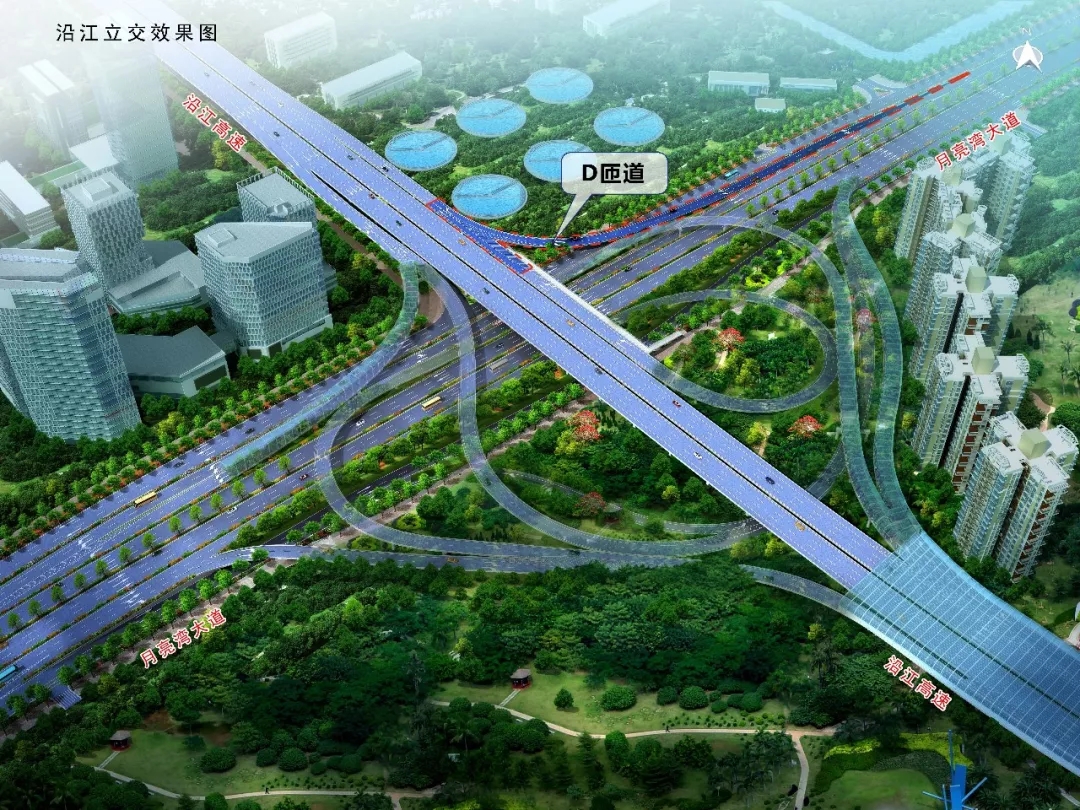 建成后車輛沿月亮灣大道南行可通過D匝道直接進(jìn)入沿江高速往廣州方向行駛。